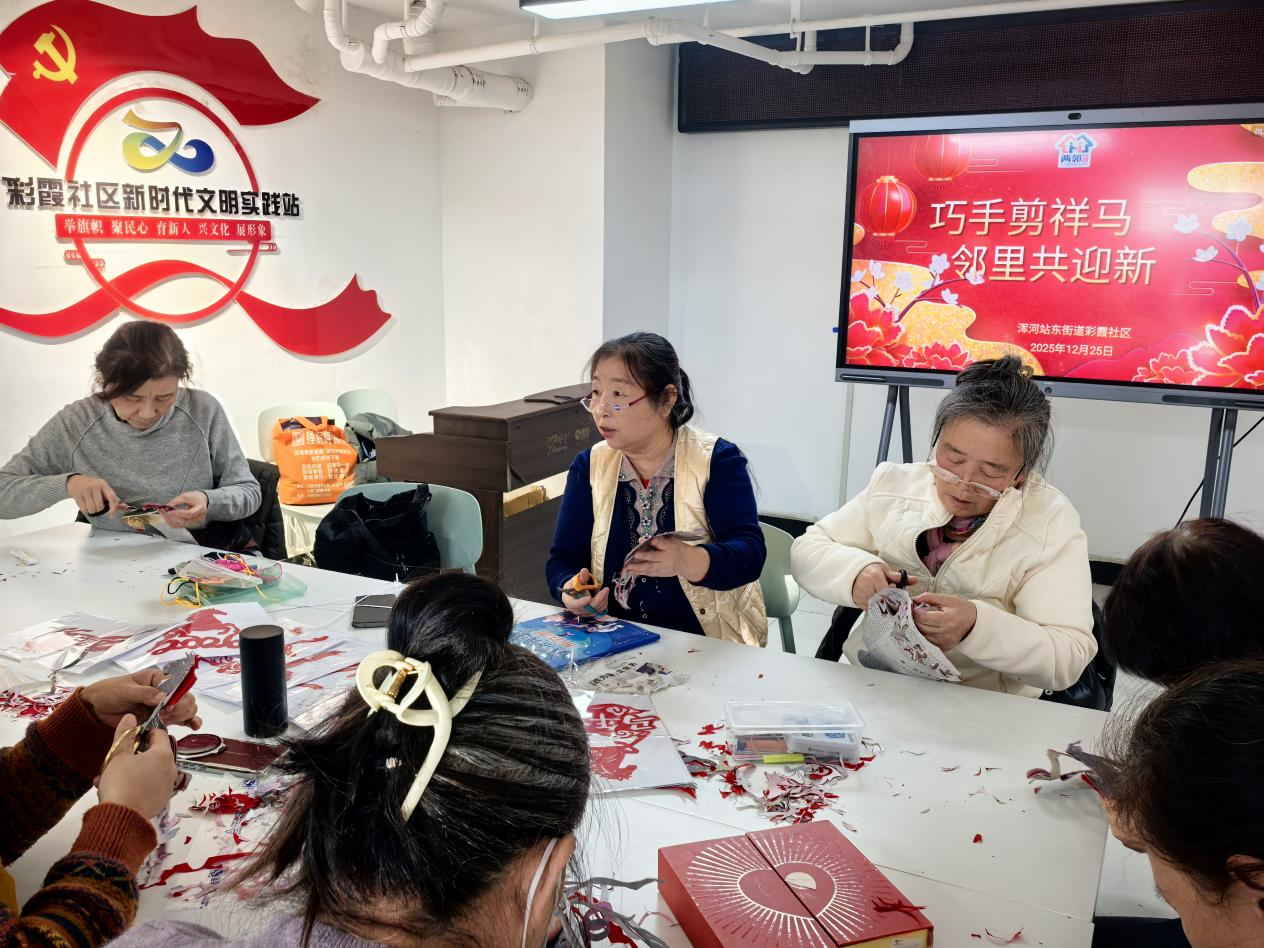 红纸翻飞,剪刀轻响,元旦的脚步越来越近啦!12月25日,浑河站东街道彩霞社区里一派喜气洋洋,一场“巧手剪祥马,邻里共迎新”主题剪纸课堂欢乐开讲,居民们欢聚一堂,用指尖技艺剪出生动祥马,让浓浓的年味和暖暖的邻里情在寒冬里蔓延开来。