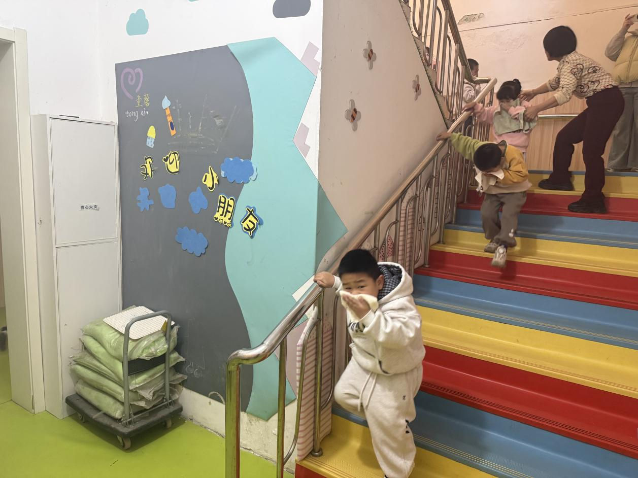 随着模拟火警警报响起,应急疏散演练正式开始。各班教师快速响应,组织幼儿用湿毛巾捂住口鼻、弯腰低姿前行,严格按照预定疏散路线有序撤离。在楼梯、通道等关键位置,工作人员全程引导护航,幼儿听从指挥、文明有序,快速撤离至操场安全区域,整个过程高效顺畅,达到预期演练效果。