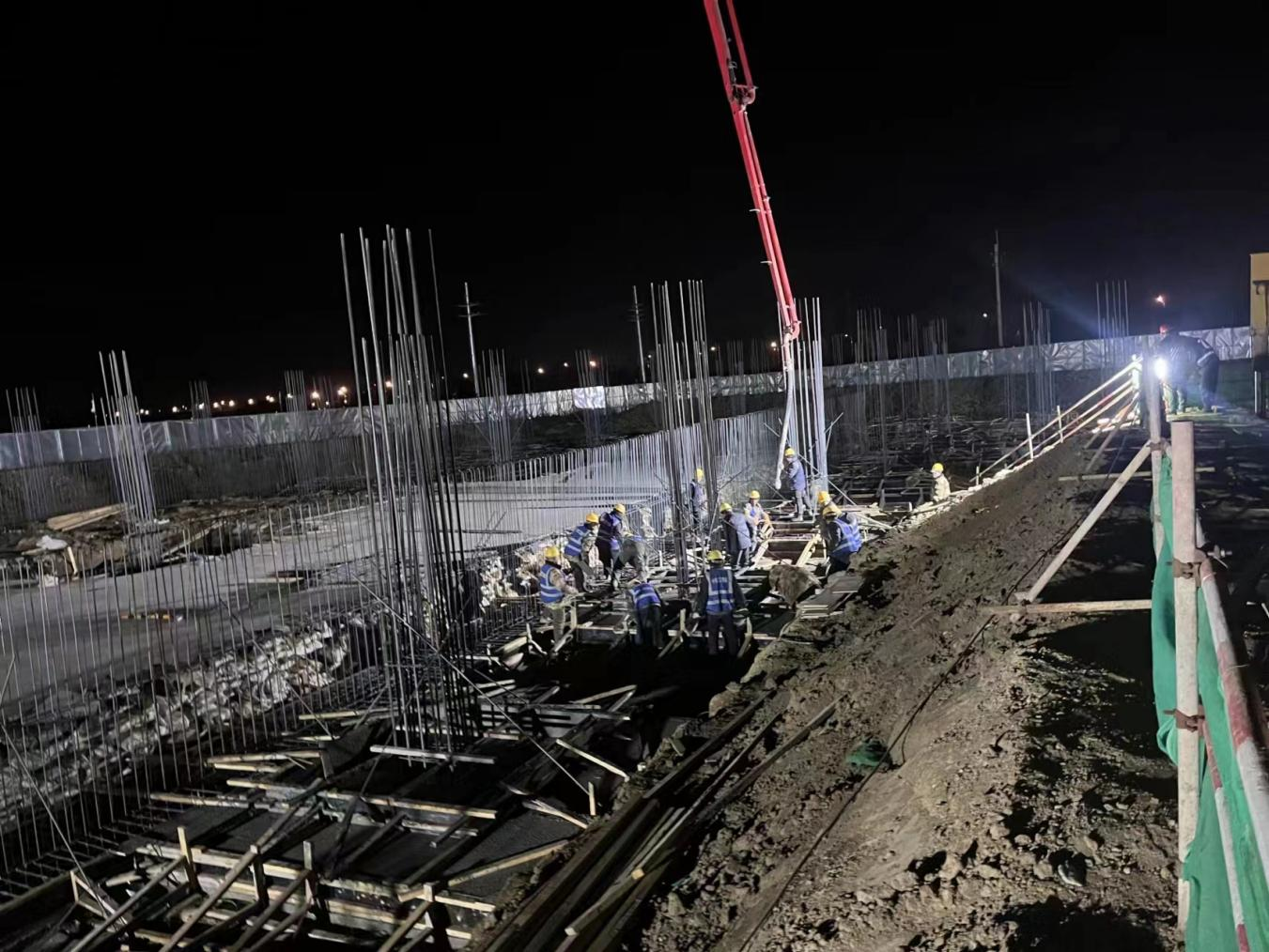 在市政交通建设项目现场,灯火通明、机械声不断,摊铺机匀速前进,压路机来回穿梭,运料车在这里排成了一条长龙,施工人员也正有条不紊地引导车辆有序进出。据了解,市政交通建设现场每日夜间施工人数超300人,道路基础换填已经全部完成,第一层沥青摊铺完成6123米,电力排管完成1920米,3座泵站设备安装全部完成,管廊干线主体结构完成98%,廊内安装工程完成70%,具备管线入廊条件。