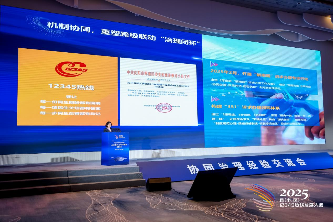 此次大会聚焦县(市、区)12345热线新质发展,搭建起全国范围内经验交流、成果共享的重要平台。会上,浑南区公共服务综合指挥中心主任刘春艳作为县(区)级单位代表,在协同治理主题交流环节,以“激活民意诉求热线‘强引擎’ 打造‘12345+’聚合治理新生态”为核心,向来自全国各地的与会代表详细分享浑南区在诉求办理、诉源治理中的典型做法与实践经验,得到现场广泛关注与认可。