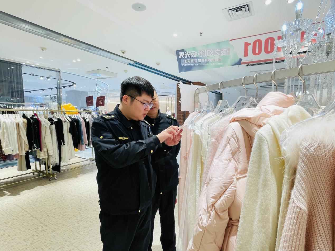 线下层面,针对商超人流密集、促销集中的特点,区市场监督管理局对盛京大奥莱等重点商场开展专项检查,创新采用“体检式”执法模式,聚焦家用电器、服装鞋帽、化妆品等热销品类开展全方位“诊断”。执法人员通过“一看、二问、三查”,严把商品质量关,细致查验标识标签、成分含量、3C认证等关键信息;严管经营行为,排查虚假宣传、价格欺诈等违规问题;强化服务引导,现场宣讲法规并指导企业落实进货查验、台账完善等制度。对个别标签不规范等轻微问题,执法人员秉持包容审慎原则,指导商户立整立改。
