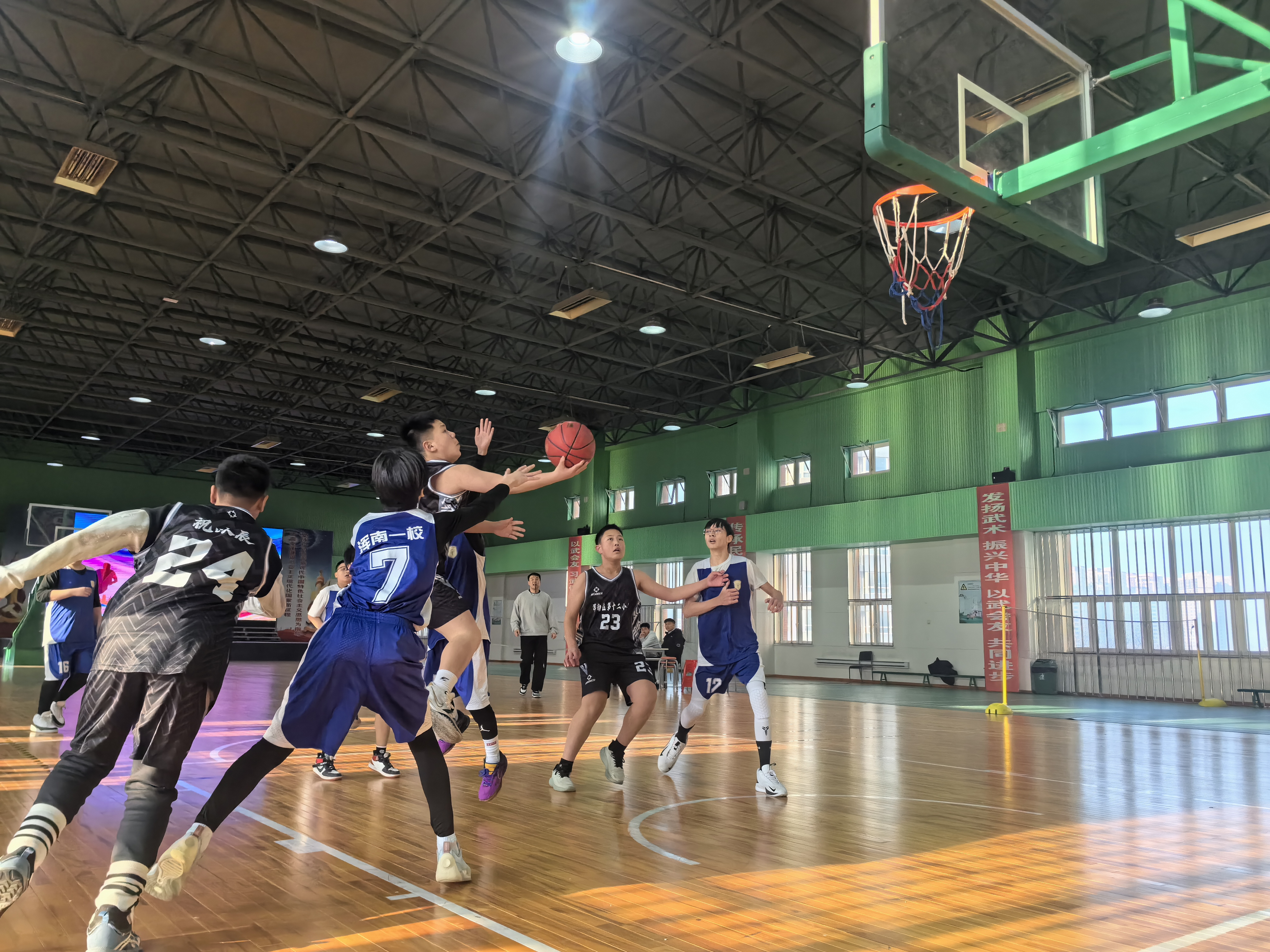 赛场上,运动员们意气风发、斗志昂扬。哨声一响,球员们迅疾投入战局,运球突破如电光石火,默契传球似行云流水,精准投篮划出飒爽弧线,严密防守凝成铜墙铁壁。进攻时的奋勇争先、防守中的同心协力、得分后的振臂欢呼、落后时的咬牙坚守,每一帧画面都跃动着青春的蓬勃力量。少年们秉持“友谊第一、比赛第二”的准则,赛后列队致意、惺惺相惜,于竞技中体悟尊重,在对抗中收获成长,将体育精神的真谛诠释得淋漓尽致。