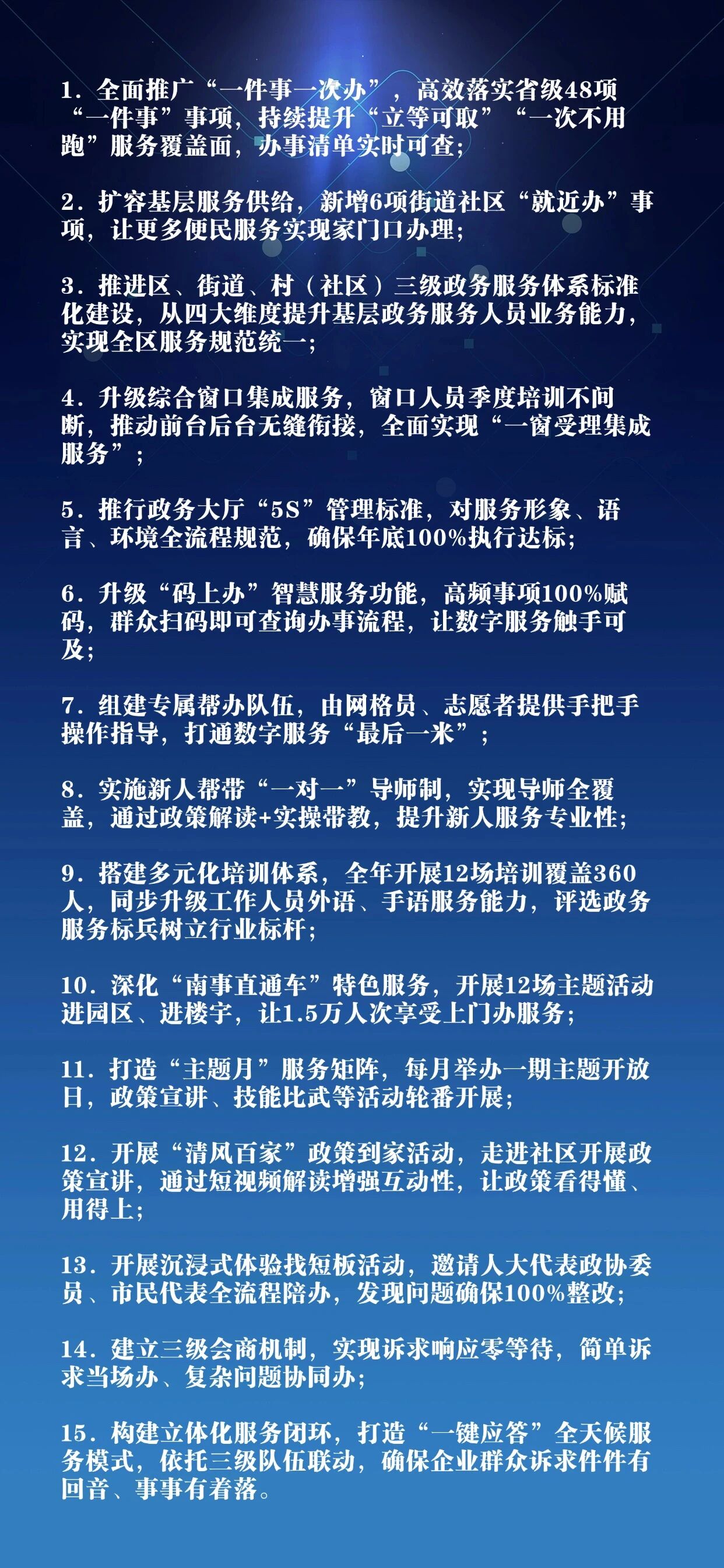 此次15项便民举措的推出,是深化营商环境建设的重要举措,涵盖政务服务流程优化、基层服务扩容、智慧服务升级、队伍能力提升、特色品牌打造、全流程监督问效等全维度建设。下一步,区政务服务中心将统筹各方强化协同联动、狠抓执行落实,以更优作风、更高效率、更实举措推动15项便民举措落地见效,持续优化区域政务服务环境,让“浑南政好”品牌更加深入人心,为区域发展营造优质政务营商环境。