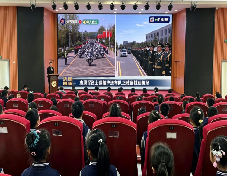 全区各中小学以班级为单位,将烈士遗骸迎回仪式直播作为活动核心内容,实现师生全员覆盖、全程规范收看。各校园会场秩序井然,师生整齐着装、端坐静候、专注观看,在庄严肃穆的氛围中沉浸式感受“山河无恙、英雄归家”的厚重内涵,让崇尚英雄、缅怀先烈、矢志报国的信念深深扎根心底。七十三中学师生列队操场、肃立脱帽、行注目礼,齐唱国歌目送战机过境;在六十三中学、创新一小的少先队员整齐列队、齐声呼号、敬队礼;浑南一中、北师附校(沈阳)、英达中学、浑南九小、建大附小、白塔小学同步举行缅怀英烈主题升旗仪式,师生们在五星红旗下肃立致敬、齐唱国歌,以最庄重的礼仪迎接英魂归来,让抗美援朝精神在校园直抵人心。