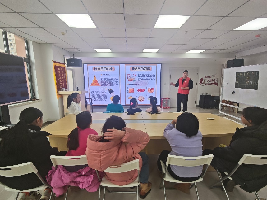 活动伊始,社区志愿者以生动有趣的讲解,带孩子们走进腊八节的文化世界。从“腊者,猎也,言田猎取禽兽,以祭祀其先祖也”的起源传说,到南北各地“喝腊八粥”“腌腊八蒜”“吃腊八面”的习俗差异,再到“朱元璋忆粥”的经典典故,一个个鲜活的故事、一段段深厚的民俗渊源,让孩子们听得津津有味,纷纷举手提问,现场互动氛围热烈。通过知识分享,青少年们不仅了解了腊八节背后的文化内涵,更感受到了中华传统节日承载的感恩、祈福、团圆等美好寓意。