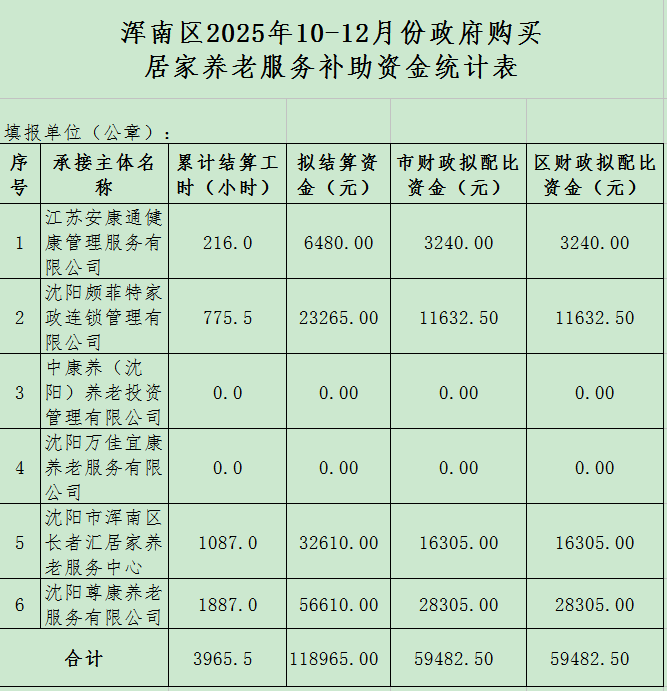 依据市民政局《关于做好沈阳市2025年政府购买居家养老服务工作的通知》规定,现申请拨付2025年10-12月政府购买居家养老服务试点补贴资金。现公示如下: