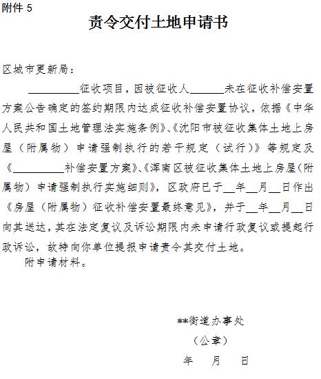 17.在《交付土地通知书》规定的期限内被征收人仍拒不搬迁和交付土地的,自《交付土地通知书》规定的期限届满之日起5日内,由市自然资源局浑南分局、市自然资源局沈抚分局作出《责令限期交付土地决定书》(附件8),并依法送达被征收人。