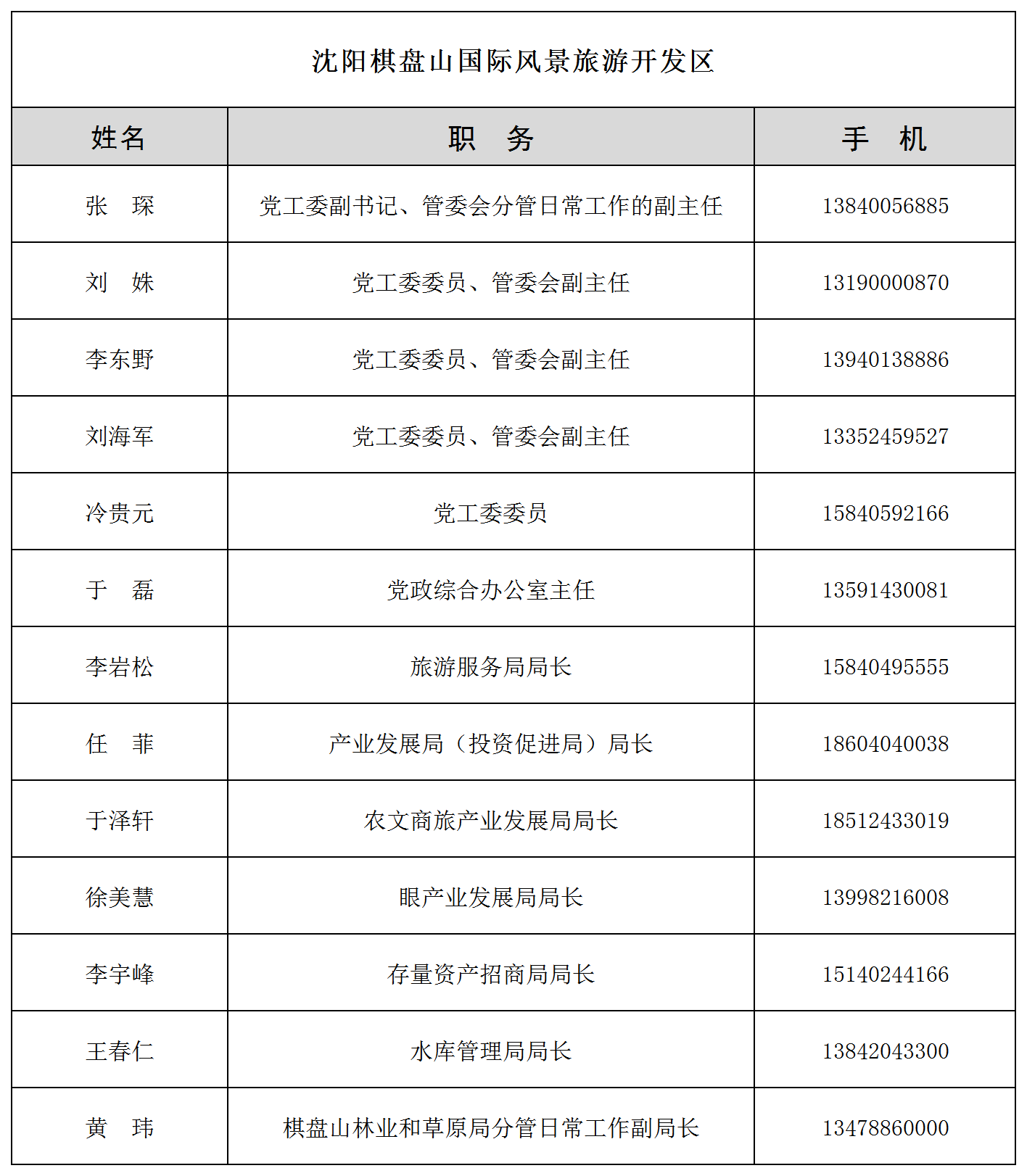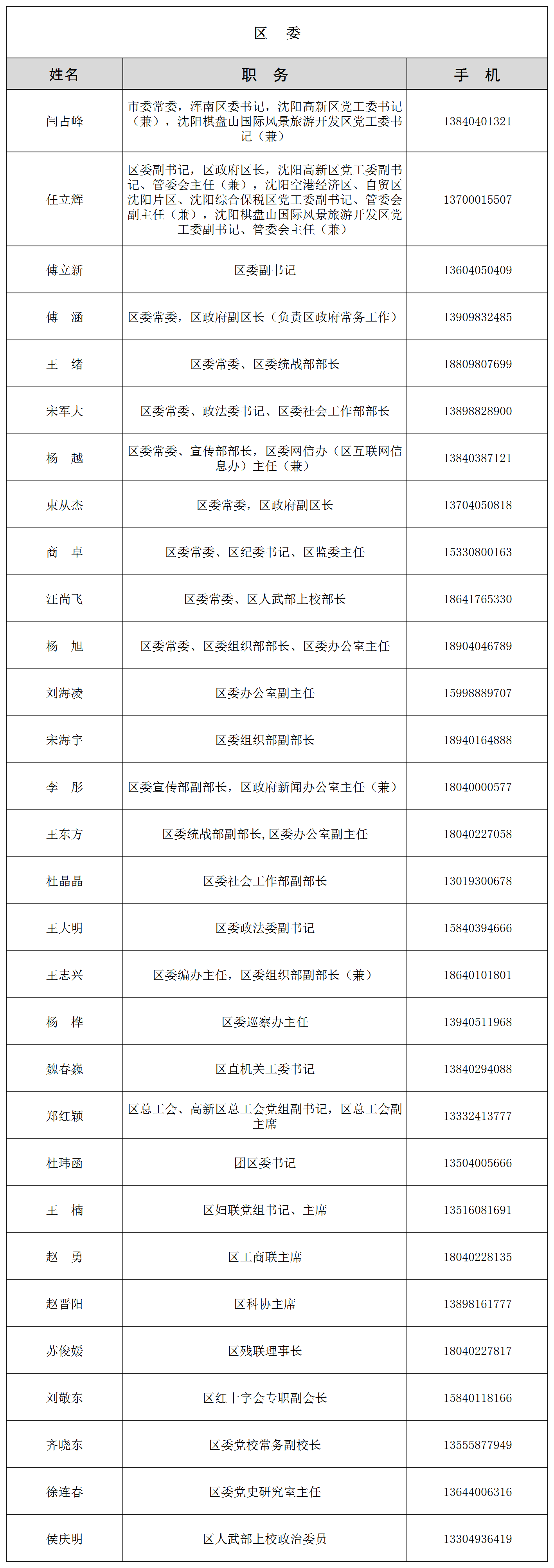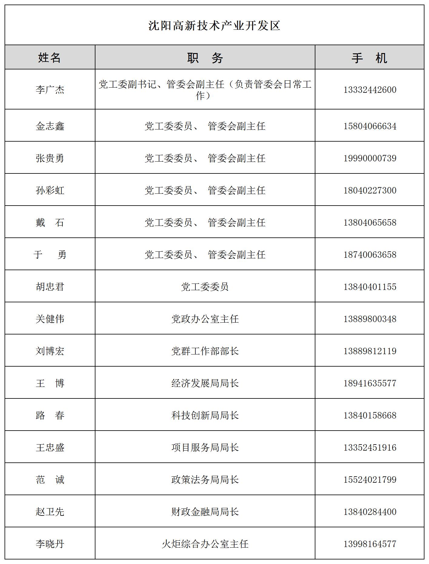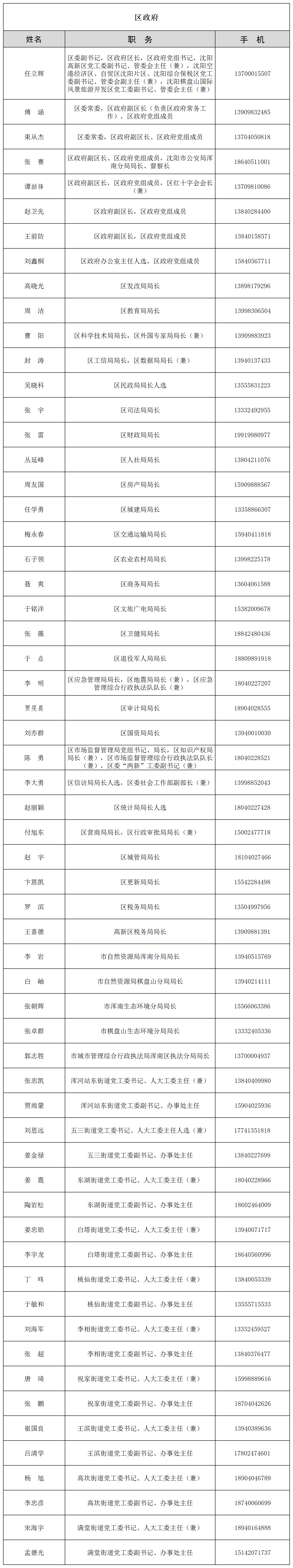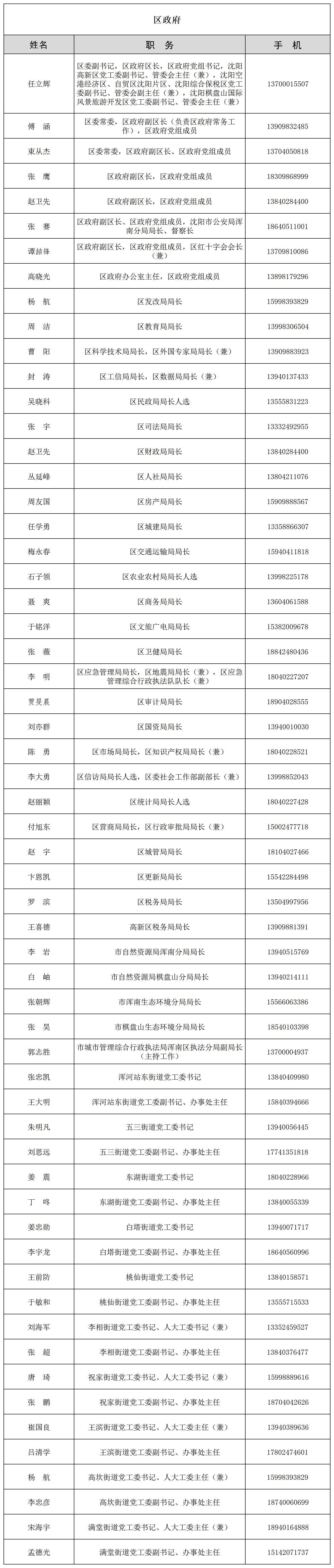 为进一步密切联系群众,畅通干部群众联系渠道,现将浑南区委、区政府,沈阳高新区、沈阳棋盘山开发区领导干部及相关部门负责同志联系方式公布如下。