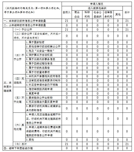 按照依申请公开的工作规范,对申请政务公开的自然人、法人的申请材料核定后进行及时处理。全年共及时受理自然人、法人的政府信息依申请公开申请21件。